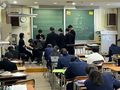 写真下:1年3組 音楽 ※「もののけ姫」の曲でリコーダーの実技テストです。