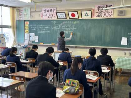 写真中:2年2組 数学「△ABEと△CDFにおいて・・・」