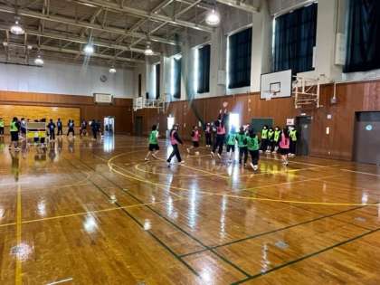 写真上:3年1組 体育 ※『バスケットボール』のゲームです。楽しそうです!