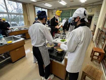写真中:2年2組 家庭 ※調理実習で「さばの味噌煮」と「すまし汁」を作っています。いいにおいです!