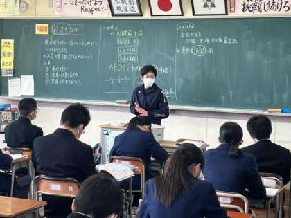 写真中:2年2組 保健 「出血などの部分を患部といいますが、清潔に保つことが大切です」