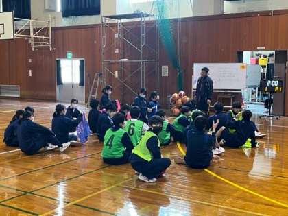 写真中:2年2組 体育 「ビブスを配ってください!」
