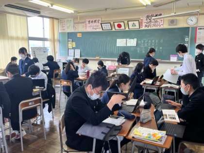 写真下:2年3組 国語 ※クロムブックを使って「最後の晩餐」のクイズを作成しています。