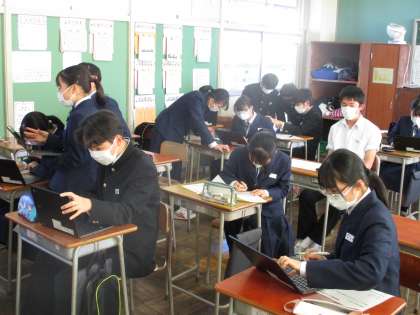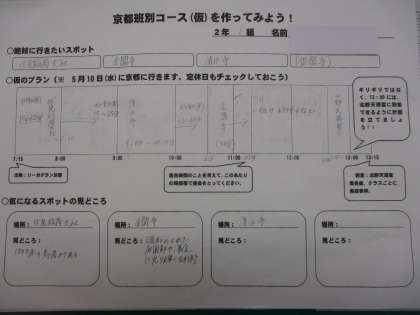 修学旅行事前学習 公開日 2023/03/03 更新日 2023/03/03 2年生 3月3日(金) 5、6限 今日は修学旅行に向けて、京都班別学習で行きたいところを各自で4つほどに絞り、コースづくりをしました。 クロムブックを使って、行き先や移動時間等を調べ、効率のよい巡り方を考えました。 写真で載せたこのプリントには、何度も消して書き直した思考の跡が見えますね。 修学旅行がますます楽しみになってきました。