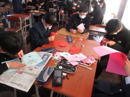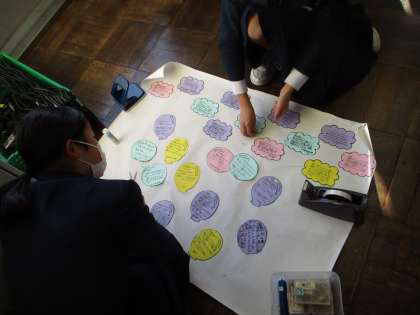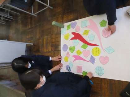 先週から、生徒会の実践部長と有志がメッセージを書くカードの形や模造紙のデザインを考えました。
