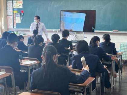 写真上:1年1組 社会 「色ペンと鉛筆だしてください」