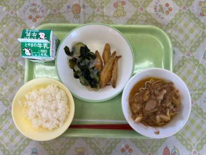 今日のメニューは 、ごはん、牛乳、わかさぎのフリッター、こんにゃくサラダ、ボルシチ。