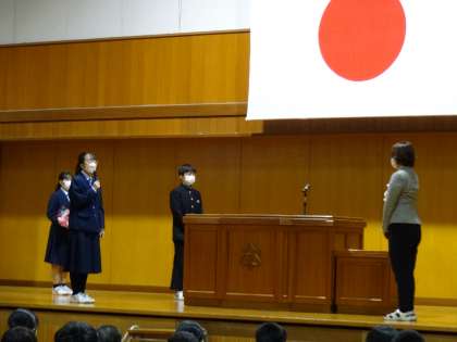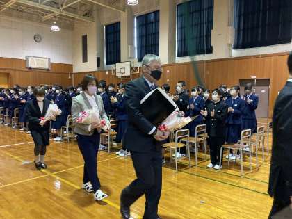 退任式・離任式 公開日 2023/03/24 更新日 2023/03/24 今日の興南中 修了式に続いて退任式・離任式が行われました。 退任・離任される3名の先生方からご挨拶を頂き、生徒の代表が感謝の言葉を述べて、花束を贈呈しました。 3名の先生方、ありがとうございました。