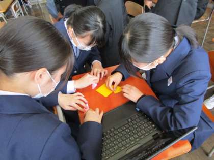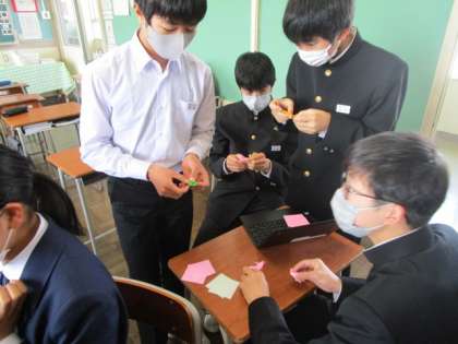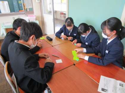 3年 総合的な学習の時間 公開日 2023/04/12 更新日 2023/04/12 3年生 修学旅行に向けて4限に学年集会を開き、平和学習を行いました。 修学旅行初日の平和セレモニーに向けて千羽鶴づくりの意義を学習し、クラスに戻って折り鶴を折り始めました。