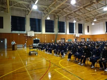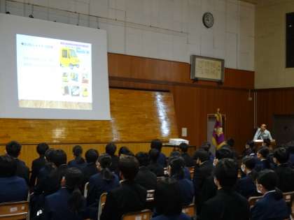 創校記念式 公開日 2023/04/14 更新日 2023/04/14 今日の興南中 1限に創校記念式を行い、講師の先生をお招きして講演会を行いました。 校区内にあるタケオカ自動車工芸の方をお招きして、タケオカ自動車様が製造・販売しているミニカーの仕組みや長所・短所、この仕事に就いたきっかけをお話ししていただきました。 「好きなことを見つければどんな仕事もやりこなせる」と激励され、生徒は目を輝かせながらお話を聞きました。 講師の先生、ありがとうございました。