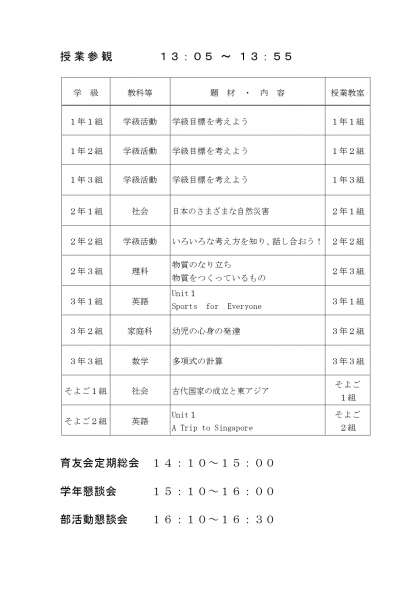 明日(4月22日)、下記の日程で授業参観等が行われます。