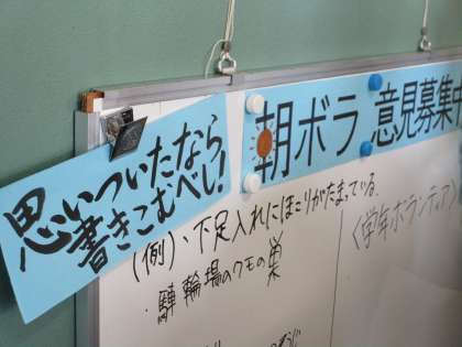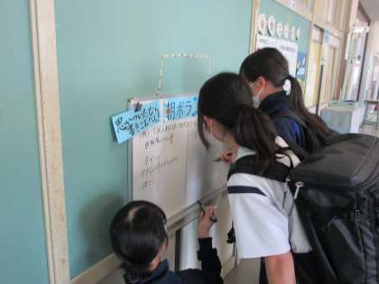 生徒会・朝ボラ・意見募集中 公開日 2023/05/02 更新日 2023/05/02 今日の興南中 5月2日(火) 放課後 生徒会が「朝ボランティア」に関する生徒の提案を募集するコーナーを保健室前に作りました。 生徒たちが熱心に見入っています。