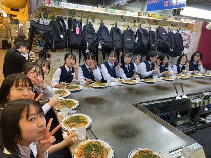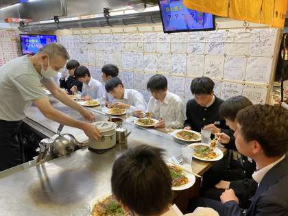 修学旅行 お好み村(3ー3) 公開日 2023/05/09 更新日 2023/05/09 3年生 夜ご飯は、お好み村でスペシャルお好み焼きを食べています。3年3組男子は、「あとむ」、女子は「厳島」というお店で食べています!