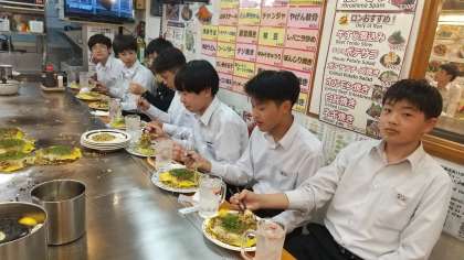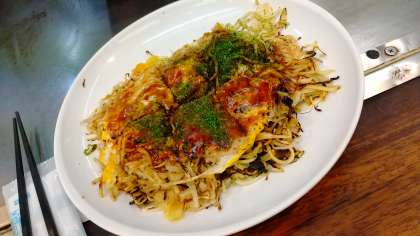 お好み村で、広島のお好み焼きをいただいています。美味しいです!