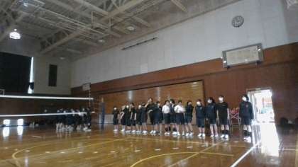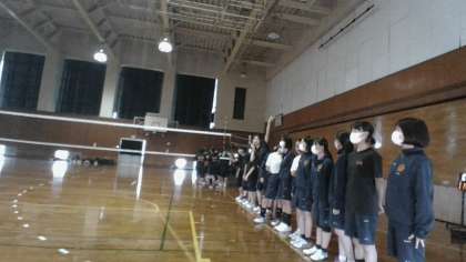 ネットを張り終えたバレーボール部が練習開始のあいさつを交わそうとしています!
