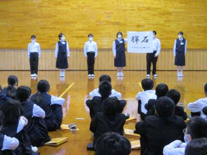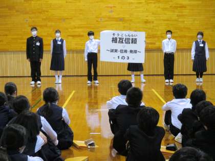 今日の学年集会では、まず初めに各クラスの学級役員の自己紹介と学級目標の紹介がありました。