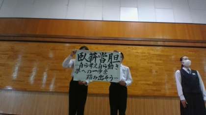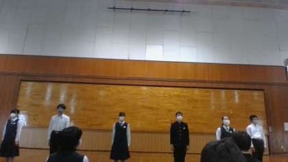2年生・学年集会・その2 公開日 2023/05/17 更新日 2023/05/17 今日の興南中 5月17日(水) 3限 7月3日から7日まで行う「社会に学ぶ『14歳の挑戦』」に向けて、実行委員の紹介と「スローガン」の発表を行いました。