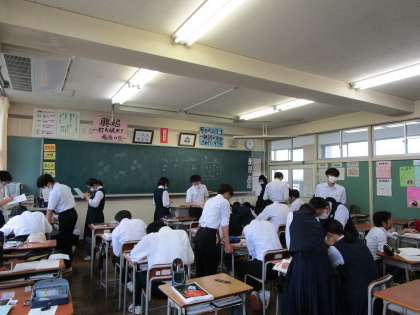 3年生 授業の様子 公開日 2023/05/19 更新日 2023/05/19 3年生 上:3年1組 理科 プリントが終わったら、それぞれ答え合わせをして、教え合います。 中:3年2組 社会 第2次世界大戦はどのように拡大していったのかを学習しています。 下:3年3組 英語 まずは、紹介する名言を探して、英文で紹介します。