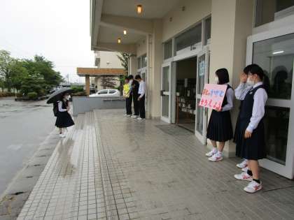 登校時の生徒玄関はいつもより静かでしたが、2・3年生が元気に実践部や朝ボランティアの活動を行っていました。