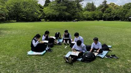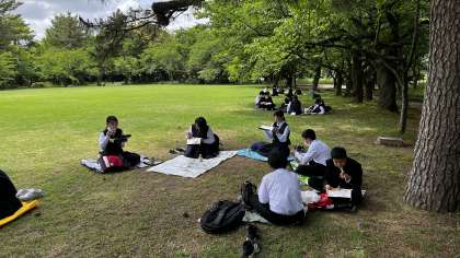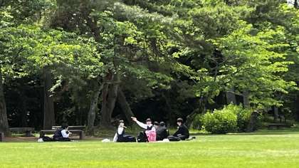 高岡古城公園の広場で、お弁当を食べています。