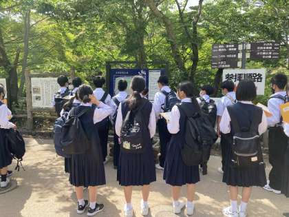 1年宿泊学習 その31(1年2組 高岡古城公園) 公開日 2023/05/23 更新日 2023/05/23 1年生 5月23日(火) 14:35 2組は古城公園周辺の散策を始めました! ガイドさんのお話をしっかり聞いてます!