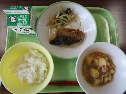 ごはん、牛乳、さばの塩焼き、香味和え、豚肉の南蛮煮
