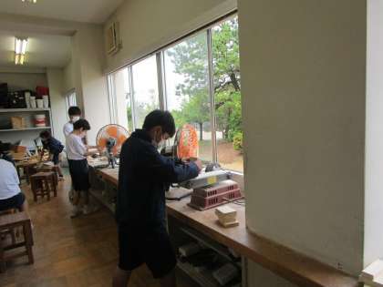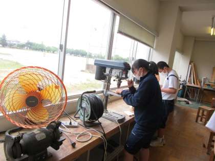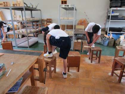 1年1組の技術・家庭科の授業です。 1枚の木の板からどんな作品ができるか楽しみです。