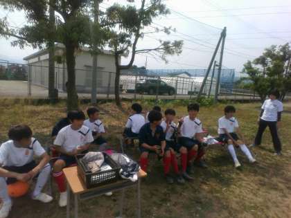 6月10日(土) 9:35 グラウンドで活動するサッカー部。 給水タイムは重要です。