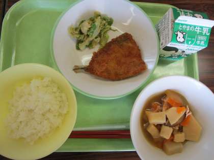 今日の給食 公開日 2023/06/20 更新日 2023/06/20 今日の興南中 6月20日(火)の献立は、 ごはん、牛乳、あじフライ、グリーンアスパラのごまだれ、高野豆腐と冬瓜の煮物 です。 あじのフライはボリュームたっぷりです。野菜もあって、毎日栄養バランスのとれた給食に感謝です。 6月 献立表はこちらです。