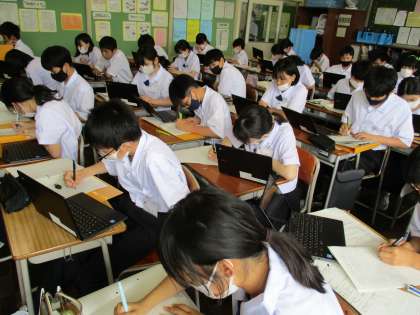 子供たちはクロムブックや図書室の本を利用して調べ、プリントにまとめていました。