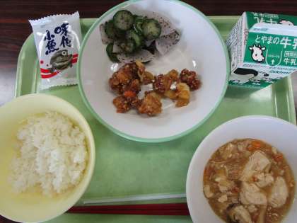 ごはん、牛乳、ほたてとじゃがいものごまからめ、ゆかり和え、豆腐の野菜あんかけ、味付け小魚