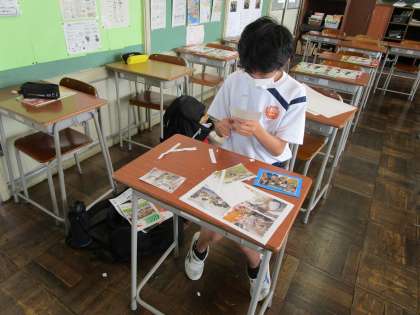 学校に登校している2年生は、他の事業所で活動している写真を掲示する準備をしてくれています。