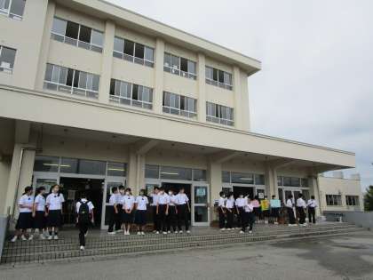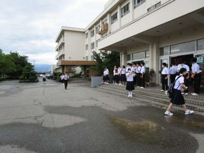 昨夜の大雨で今朝の登校が心配でしたが、朝には雨が上がり、生徒が元気に登校しました。生徒玄関では、今日も1年3組の朝ボラ、挨拶運動の元気な声が響きました。