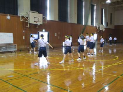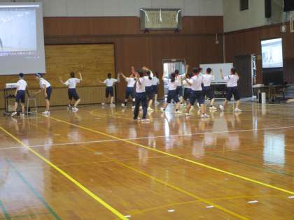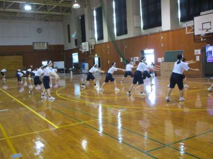 保健体育 授業の様子 公開日 2023/07/13 更新日 2023/07/13 1年生 1年2組と3年2組の合同授業です。 体育大会の団演技に組み込むソーラン節に取り組んでいます。団別に分かれて、3年生が1年生に教えながら練習しています。