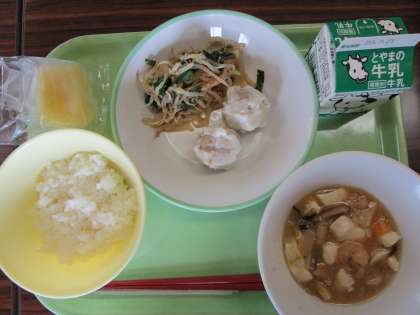 ごはん、牛乳、えびと豆腐のうま煮、肉シューマイ、ナムル、冷凍リンゴ
