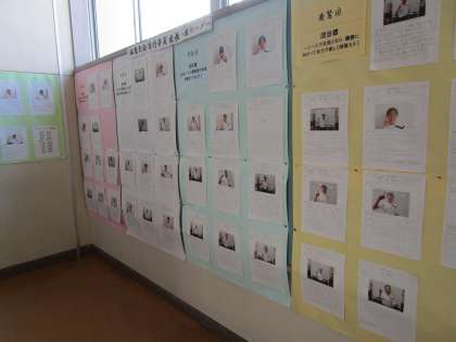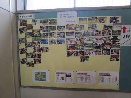 1年生の宿泊学習の記録と体育大会の団リーダーの意気込みが掲示されています。