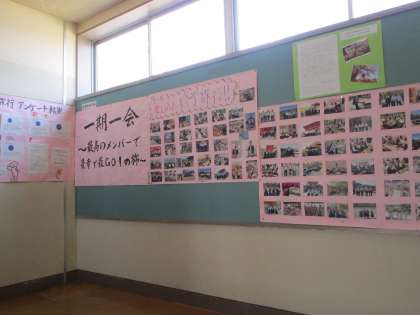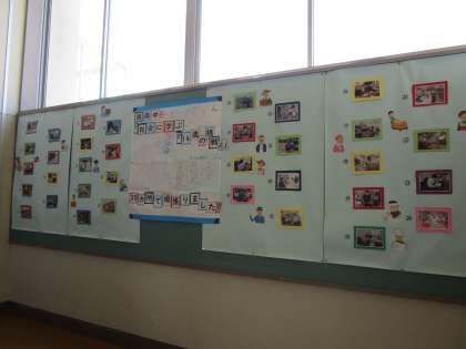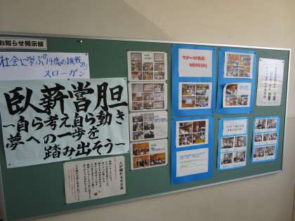 西階段には、2年生の「14歳の挑戦」の記録と3年生の修学旅行の写真が掲示されています。こちらも、見てください。