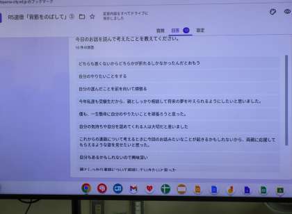 3年生 授業の様子 公開日 2023/07/19 更新日 2023/07/19 3年生 3限、3年1組 道徳の授業の様子です。 授業の振り返りでは、グーグルフォームに考えを書き込んで共有していました。 教室には、1学期の道徳の学びの跡が残っています。