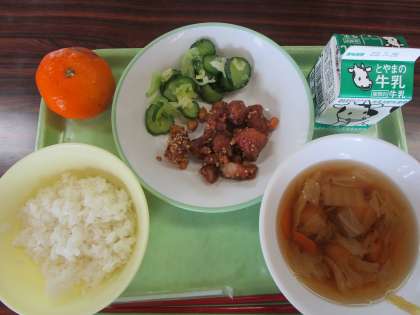 ごはん、牛乳、豚肉と大豆の甘みそからめ、きざみ和え、つみれ汁、冷凍みかん