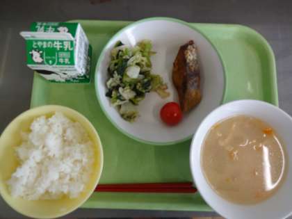 ごはん、牛乳、魚の竜田揚げ、梅肉和え、白玉汁、ミニトマト