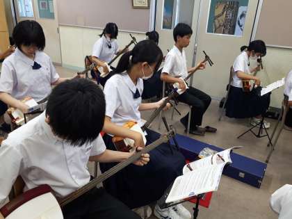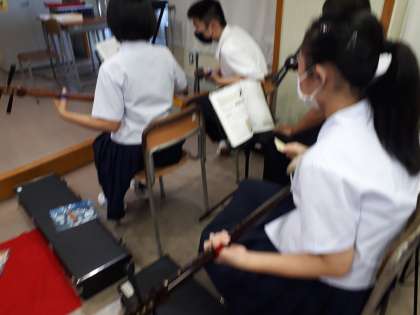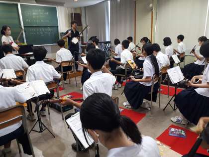 8月21日(月)三味線講習 2年3組 公開日 2023/08/21 更新日 2023/08/21 2年生 今日は3組の三味線講習の日です。 バチは三味線の太鼓に風を送るようにすることを確認し、練習スタート。今日の課題「こきりこ」に取り組みました。 曲を演奏するときは、楽譜を俯瞰するようにして音の動きを覚えることがコツなのだそうです。そしてちょっと先に目をやり演奏開始。 姿勢を正し、集中して頑張りました。
