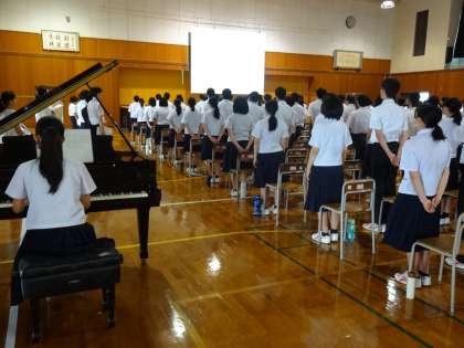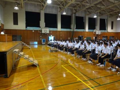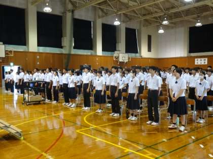 2学期始業式 その1 公開日 2023/08/28 更新日 2023/08/29 今日の興南中 34日間の夏休みを終え、全校生徒揃って始業式を行いました。 校長は式辞で「4月に立てた目標にどれだけ近付けているかを確認し、なりたい自分・つくりたい集団になるために、何ができるかを考えて取り組み続けてほしい」と話しました。 生徒の表情からは夏休みの充実がうかがい知ることができ、体育館には元気のよい校歌の歌声が響いていました。