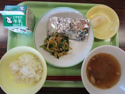 ごはん、牛乳、さばの銀紙焼き、はりはり和え、冬瓜スープ、梨
