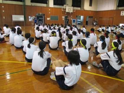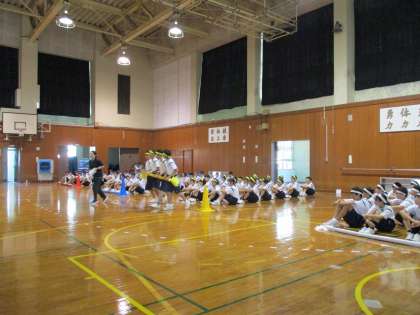 今日は体育館で体育大会の台風の目やリレーの練習をしました。