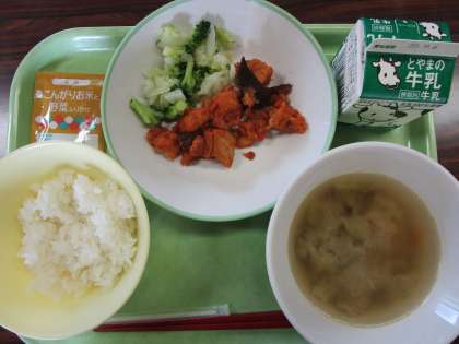 ごはん、牛乳、鶏肉とレバーのケチャップからめ、そえ野菜、なすのみそ汁、野菜ふりかけ
