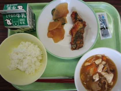 ごはん、牛乳、魚の利久揚げ、華風和え、豆腐の野菜あんかけ、のり佃煮