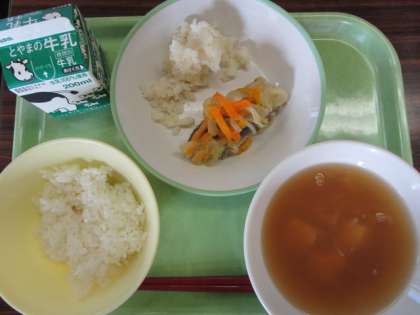 ごはん、牛乳、ふくらぎのマリネ、こふきいも、すまし汁