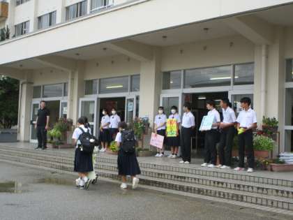 おはようございます!9月20日(水) 公開日 2023/09/20 更新日 2023/09/20 今日の興南中 空は雲で覆われていますが、生徒が登校する時間には雨は止んでいました。 生徒玄関では、3年生の校紀実践部員が「さわやか挨拶運動」で清々しい挨拶の声を響かせました。 今週は中間考査期間のため、放課後の部活動はありません。 ただし、土曜日は学校公開日のため、部活動を行います。