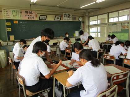 3年生 授業の様子 公開日 2023/09/21 更新日 2023/09/21 3年生 中間評価前、5教科の授業では班で教え合っている授業もあります。 上:3−1 保健体育 中:3−2 英語 下:3−3 数学