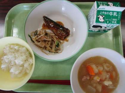 ごはん、牛乳、いわしの土佐煮、ごま和え、豚肉とじゃがいもの南蛮煮